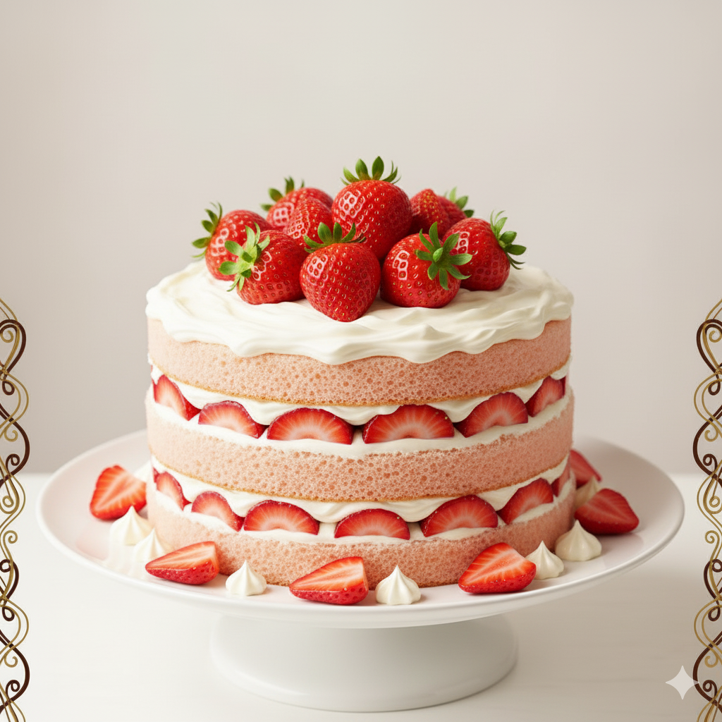 Fresh strawberry cake with creamy layers and vibrant strawberry topping, elegant and delightful.